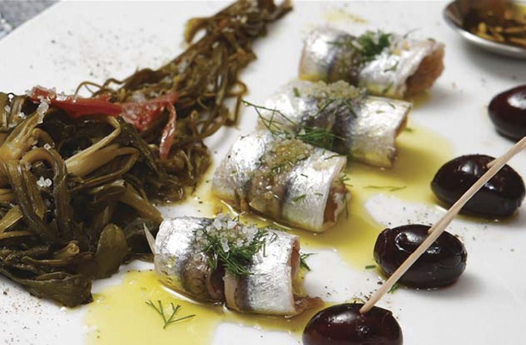 | Εκτέλεση Για τις αντζούγιες: Αφού καθαρίσουμε και φιλετάρουμε τον γαύρο τον βάζουμε με τη σειρά σε ένα τρυπητό σκεύος και ρίχνουμε από πάνω αλάτι. Βάζουμε όλα τα ψαράκια σε στρώσεις κατά τον ίδιο τρόπο και στο τέλος σκεπάζουμε με αλάτι και τοποθετούμε επάνω ένα μάρμαρο για να τα πιέζει. Αφήνουμε περίπου πέντε μέρες να ψηθούν με το αλάτι. Κατόπιν τα βγάζουμε από το αλάτι, τα ξεπλένουμε, τα στραγγίζουμε και τα τοποθετούμε σε λαδόξιδο. Για τα χόρτα: Καθαρίζουμε τις Αλμυρίδες κρατώντας τα βλαστάρια, τις πλένουμε και τις βράζουμε σε αλατισμένο νερό. Τις βάζουμε σε παγωμένο νερό για να σταματήσει ο βρασμός τους, στραγγίζουμε και προσθέτουμε λαδόξιδο. Για τη σάλτσα: Αναμειγνύουμε 1 κούπα έξτρα παρθένο ΣΠΙΤΙΚΟ, με 1/3 της κούπας κρασόξιδο, 1 κουτ. σούπας γάρο, μάραθο ψιλοκομμένο, κρεμμύδι ψιλοκομμένο και σκόρδο ψιλοκομμένο. Τα ανακατεύουμε καλά μέχρι να γαλακτοματοποιηθούν και τα ρίχνουμε πάνω από τις αντζούγιες. Από το βιβλίο Ελιά και Ρύζι, Αρχαία Ελλάδα και Αρχαία Κίνα στο ίδιο τραπέζι. Αlexandros Yotis, Nikos Foriades, Michael Guo Yi, Εκδόσεις Μοτίβο. |